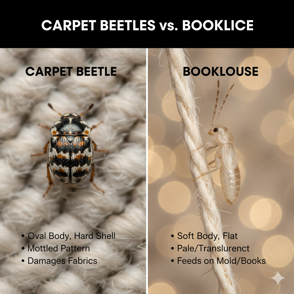 Booklice are tiny, soft-bodied insects that may move quickly, leading to confusion with carpet beetle larvae. They thrive in humid areas with mold, such as bookshelves or damp corners, whereas carpet beetles prefer dry natural fibers and fabrics.
