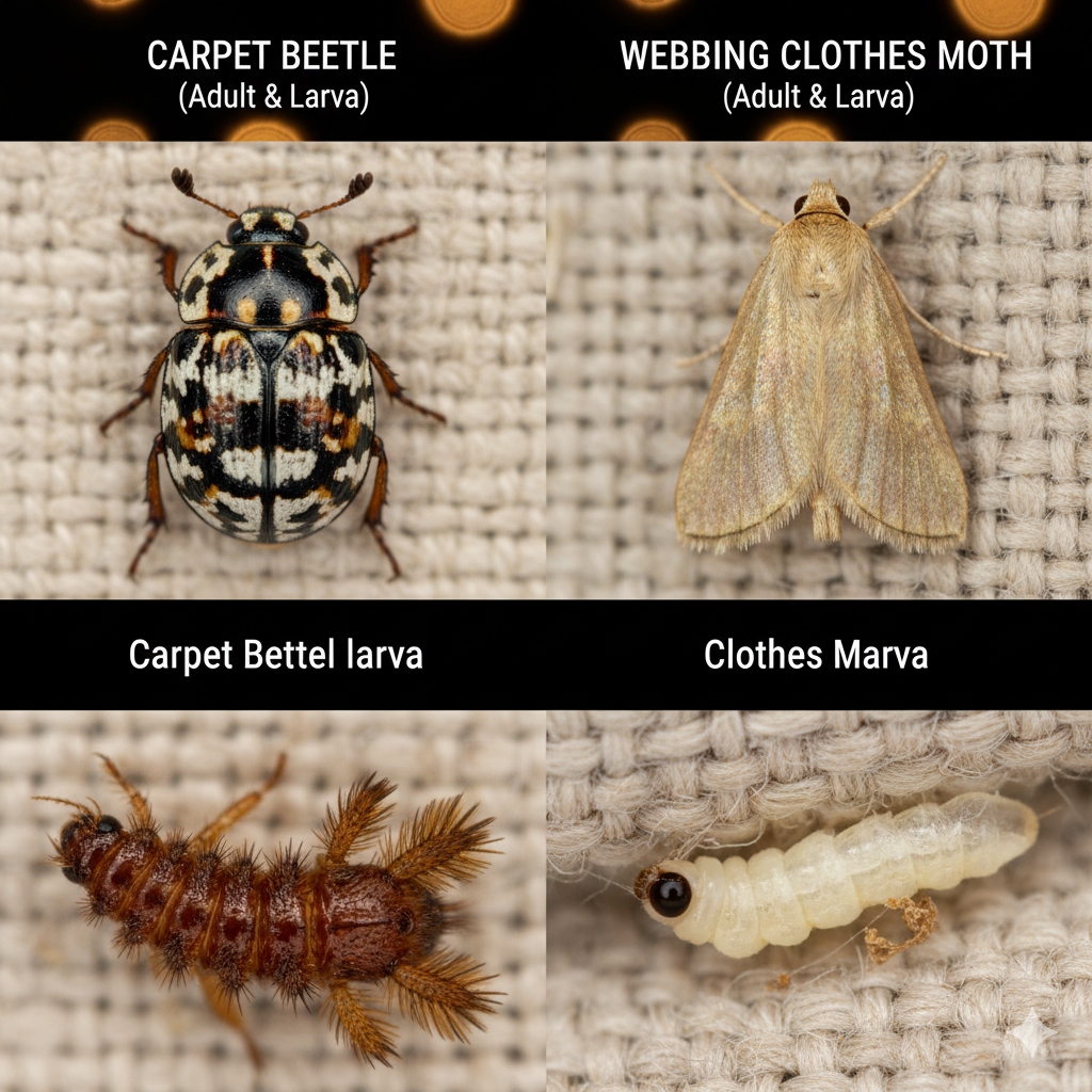 Carpet beetle larvae and clothes moth larvae both feed on natural fibers, causing similar damage. However, clothes moth larvae tend to spin silky tunnels in fabrics, while carpet beetle larvae leave irregular holes and shed skins. Recognizing the type of damage can guide the correct pest treatment.