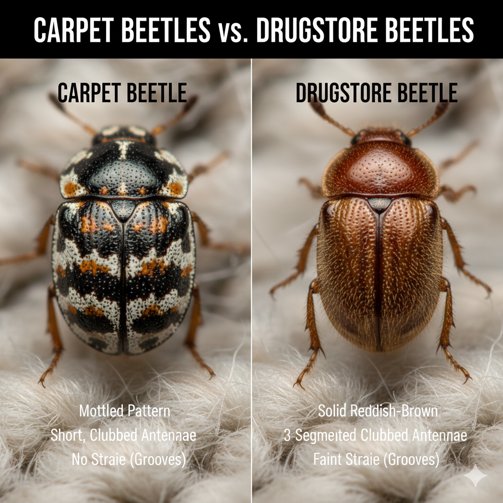 Both carpet beetles and drugstore beetles may have brown coloring, making identification tricky. Drugstore beetles have elongated bodies, wings, and a snout, and they primarily infest stored food, unlike carpet beetles that attack fabrics and fibers.