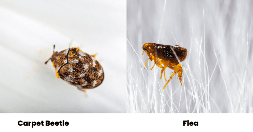 Fleas are tiny, dark, and jumping insects, which often leads people to confuse them with carpet beetles. Unlike fleas, carpet beetles cannot jump and have a more rounded body shape. Flea bites on pets or humans are a distinguishing factor, whereas carpet beetles mainly damage fabrics.