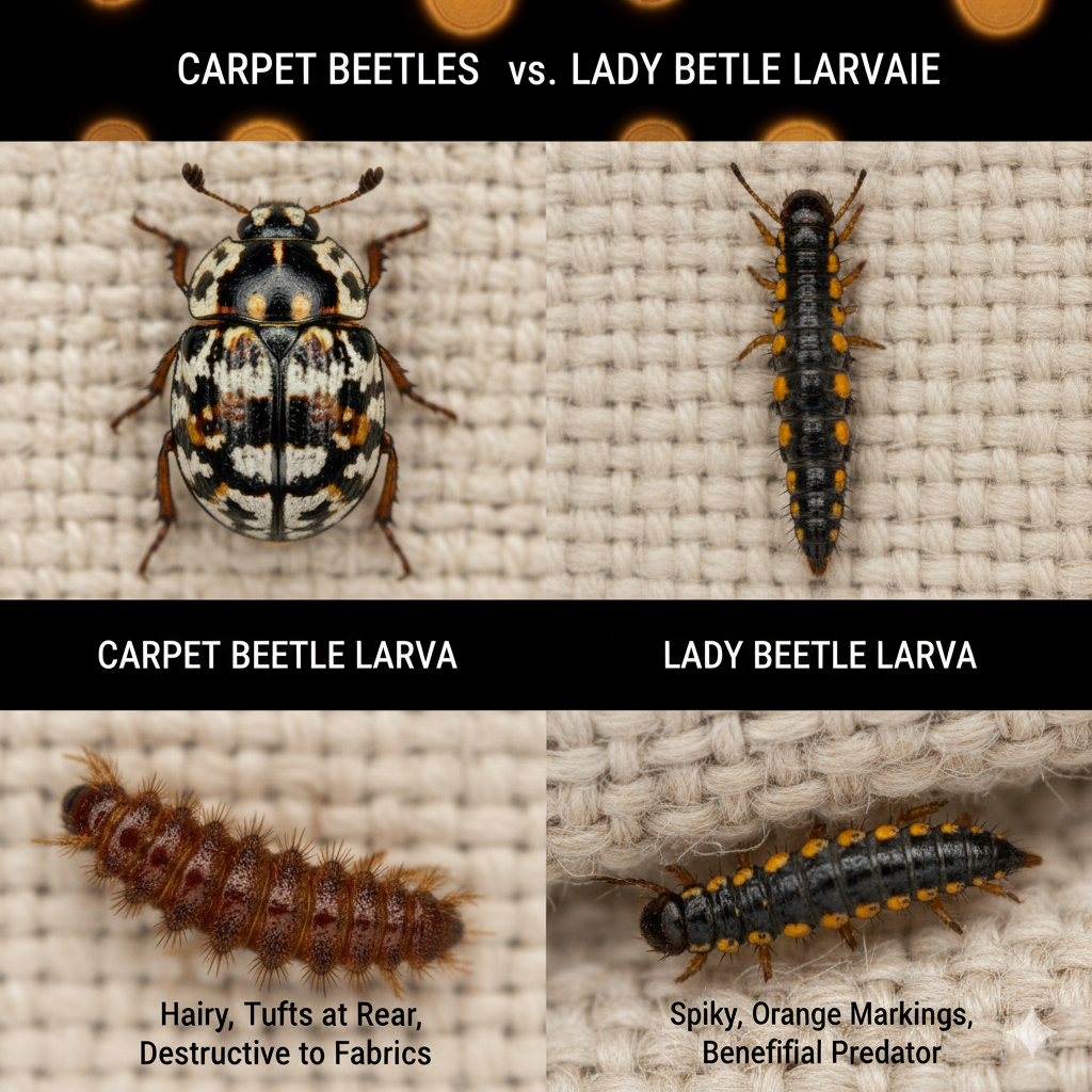 The larvae of lady beetles are spiky and dark-colored, which can resemble carpet beetle larvae. However, lady beetle larvae are often found outdoors on plants or near aphid infestations, while carpet beetle larvae infest carpets, clothing, and furniture indoors.