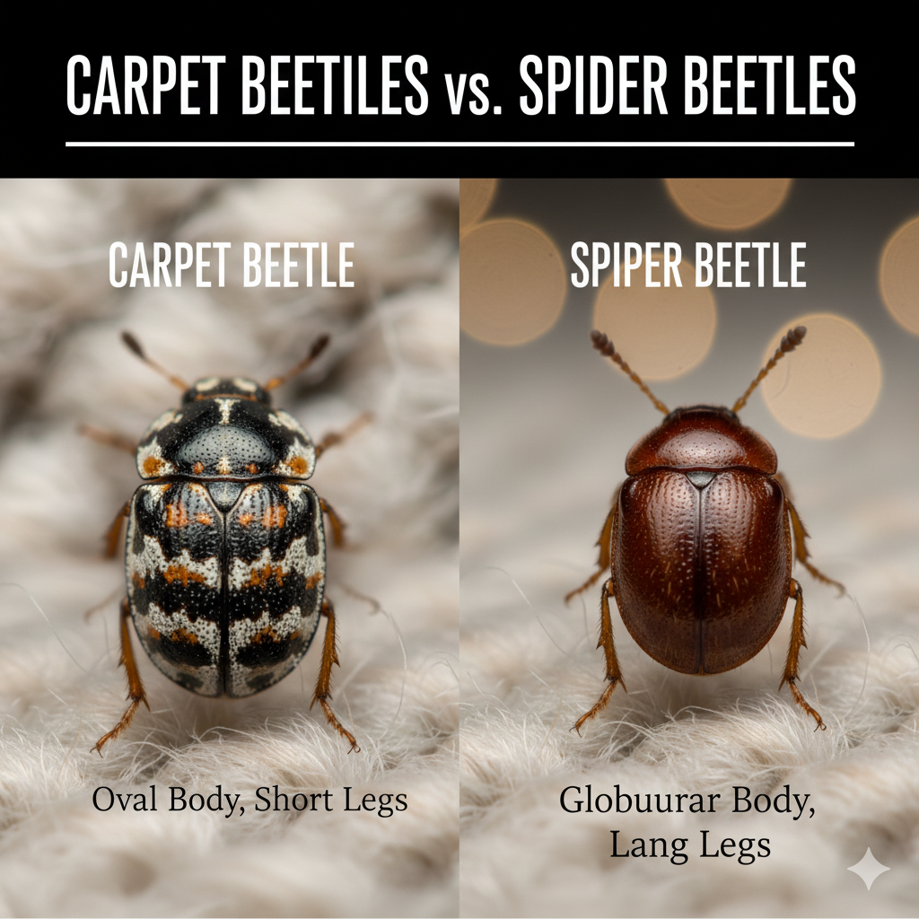 Spider beetles resemble small spiders due to their round body and long legs, which can be mistaken for carpet beetles. Spider beetles often appear in stored food or dry pantry areas, whereas carpet beetles target fabrics, carpets, and clothing.