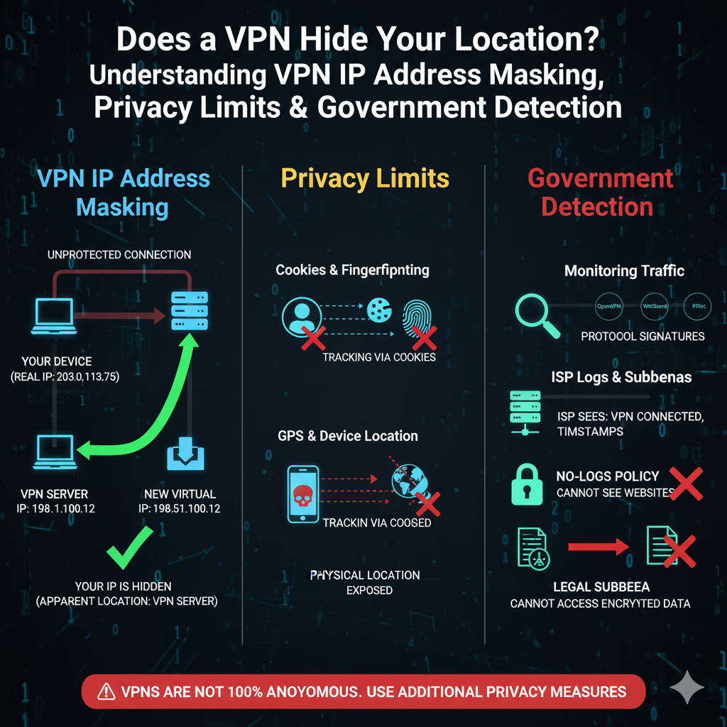 How VPNs Hide Your Location Your IP address is a unique identifier assigned by your internet service provider (ISP). It contains information about your approximate geographic location, such as the